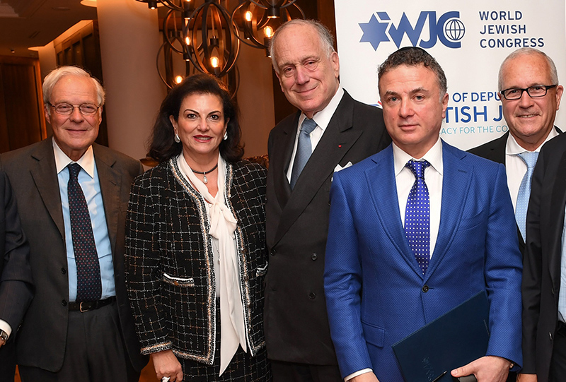 Слева направо: председатель Правления ВЕК Дэвид де Ротшильд, казначей ВЕК Челла Сафра, президент ВЕК Рональд С. Лаудер, президент ЕАЕК Михаил Мирилашвили и председатель ВЕК-Израиль Гад Ариэли. Фотография: Шахар Азран.