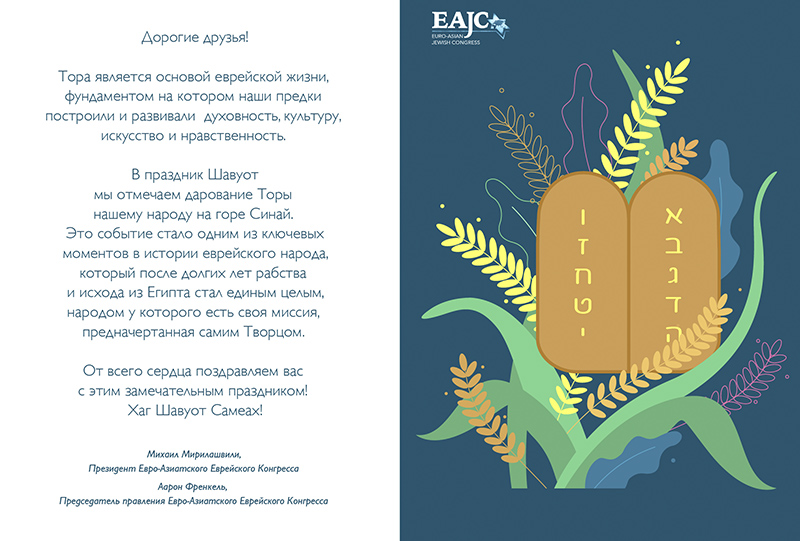 Дорогие друзья! Тора является основой еврейской жизни, фундаментом на котором наши предки построили и развивали духовность, культуру, искусство и нравственность. В праздник Шавуот мы отмечаем дарование Торы нашему народу на горе Синай. Это событие стало одним из ключевых моментов в истории еврейского народа, который после долгих лет рабства и исхода из Египта стал единым целым, народом у которого есть своя миссия, предначертанная самим Творцом. От всего сердца поздравляю вас с этим замечательным праздником!
